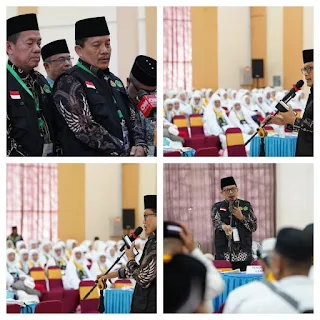 Medan, Tiga Dara Media - Sekretaris Petugas Penyelenggara Ibadah Haji (PPIH ) Embarkasi Medan Tahun 1446 H /2025 M Drs.H. Muhammad Yunus, MA menyambut kedatangan jemaah calon haji Kloter 8 di Aula Jabal Nur Asrama Haji Medan, Jumat (9/5/2025).